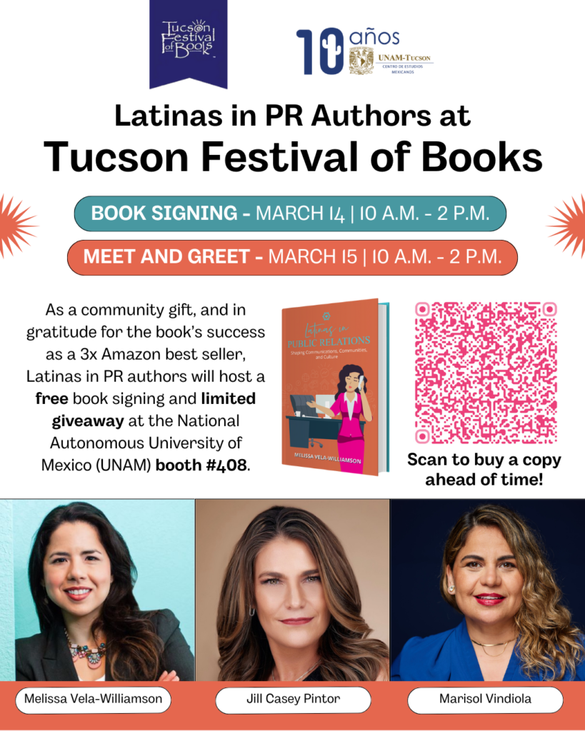 Melissa Vela-Williamson, an accredited, internationally recognized public relations strategist and Public Relations Society of America (PRSA) Fellow, from San Antonio, Texas and Tucson, Arizona PR professionals, Marisol Vindiola and Jill Casey Pintor invite the public to join them in celebrating the first anniversary of their best-selling anthology, “Latinas in Public Relations: Shaping Communications, Communities, and Culture.”
